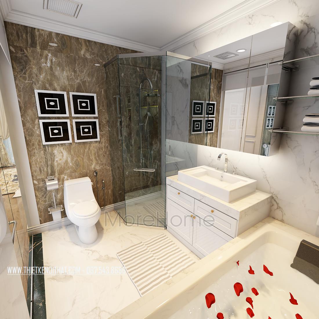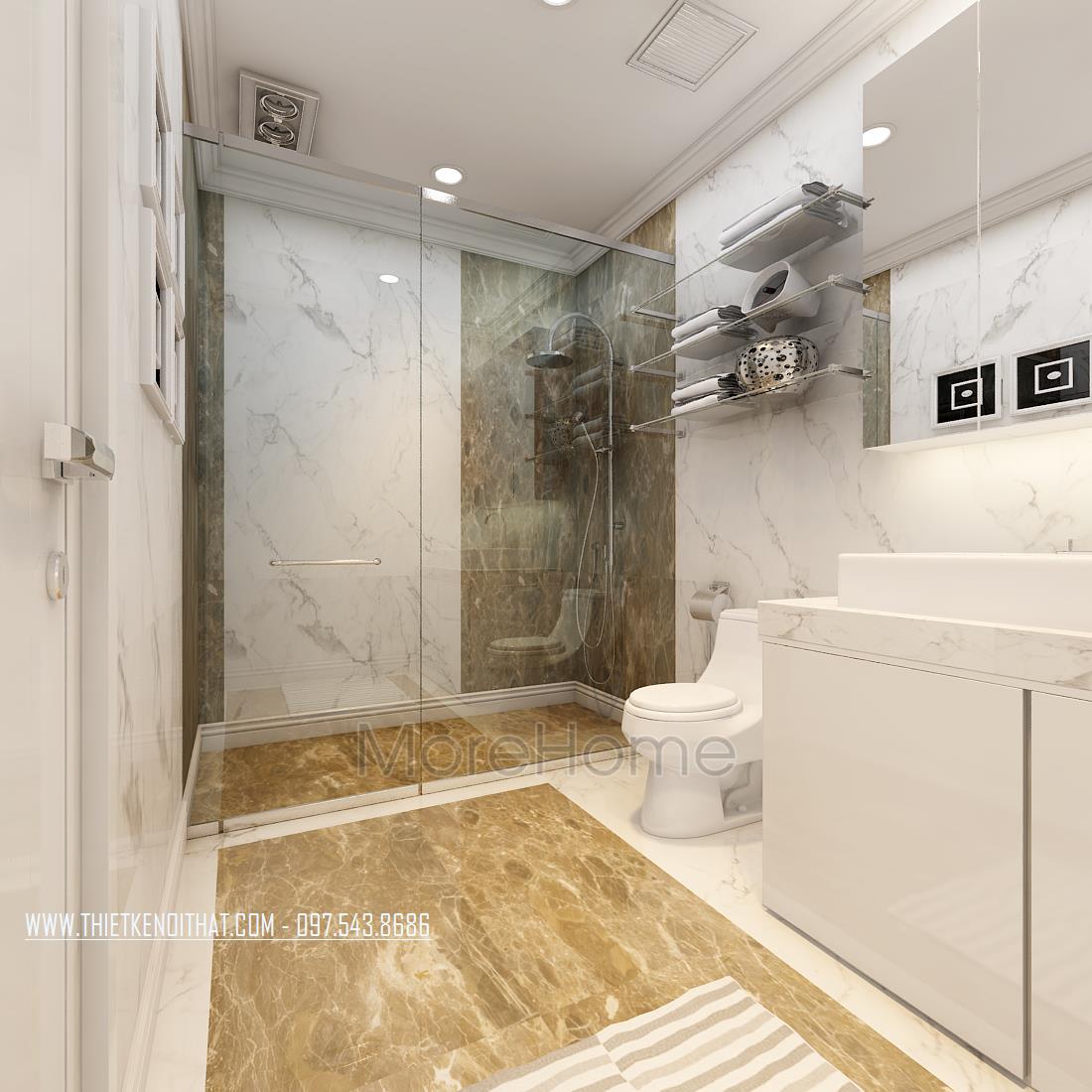 Cuối cùng là thiết kế nội thất phòng tắm hiện đại. Các vật liệu nhẹ như gương, kính cường lực trong suốt là các vật liệu được sử dụng nhiều nhất giúp tạo sự liền mạch và tăng độ mở cho không gian. Đá tự nhiên ốp tường hoa văn đơn giản, vừa đảm bảo tính thẩm mỹ lại dễ dàng lau chùi.