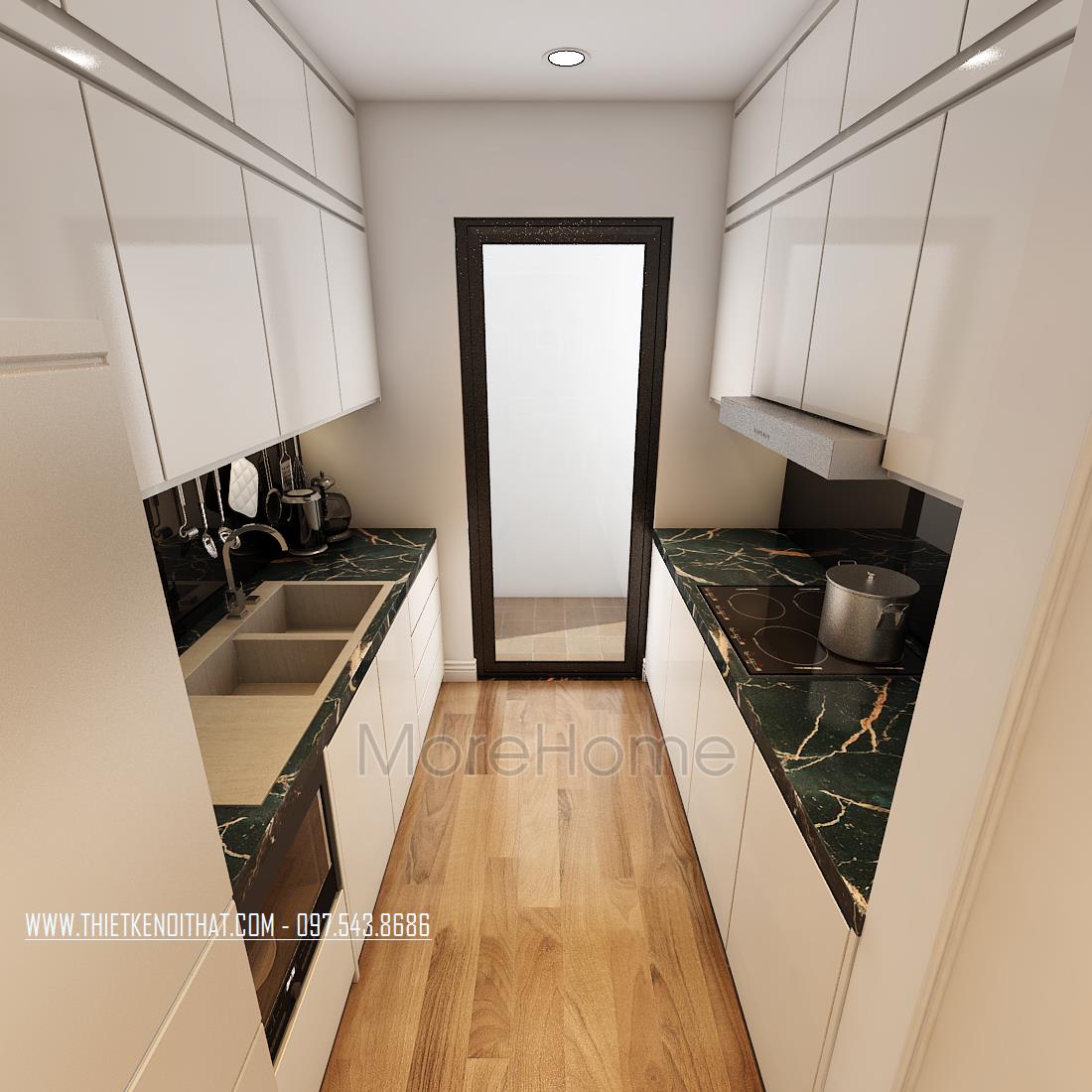 Thiết kế nội thất căn bếp nhỏ được bố trí thông với lối ra phía sau căn hộ. Thiết kế cửa kính trong suốt mang ánh sáng tràn vào không gian bếp, góp phần khắc phục nhược điểm về diện tích của căn phòng. Hệ thống tủ bếp đối xứng, đa ngăn đảm bảo tính tiện nghi cho gia chủ. Thiết kế kệ đá hoa văn đơn giản, tone màu đen trung tính hiện đại và tinh tế. Với thiết kế kệ đá, kiến trúc sư cũng giúp cho gia chủ dễ dàng hơn trong việc dọn dẹp và lau dọn căn bếp.