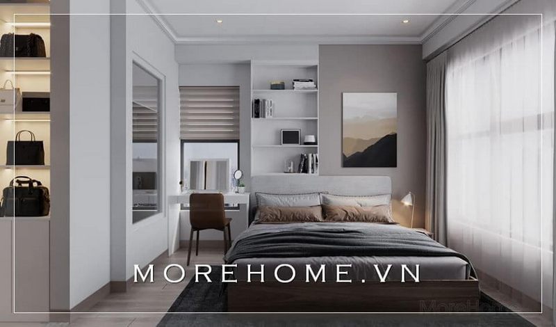Ấn tượng với kệ tủ đồ gỗ kết hợp, thiết kế âm tường kịch sàn rất tiện lợi và phù hợp với không gian căn phòng ngủ chung cư, nhà phố.