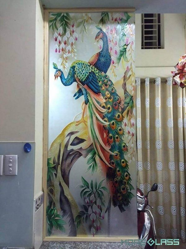 Để giúp bạn có một phòng khách đẹp, mẫu vách kính được khắc 3D có hình ảnh hai chim công để mang lại sự may mắn và thịnh vượng cho gia chủ.