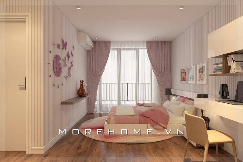 Nội thất gỗ công nghiệp cao cấp sẽ góp phần tạo nên vẻ đẹp sang trọng, đẳng cấp cho không gian căn phòng. Thay vì bức tường thông thường, cửa kính ban công sẽ giúp căn phòng luôn thoáng mát và sáng sủa hơn khi tận dụng ánh sáng tự nhiên.