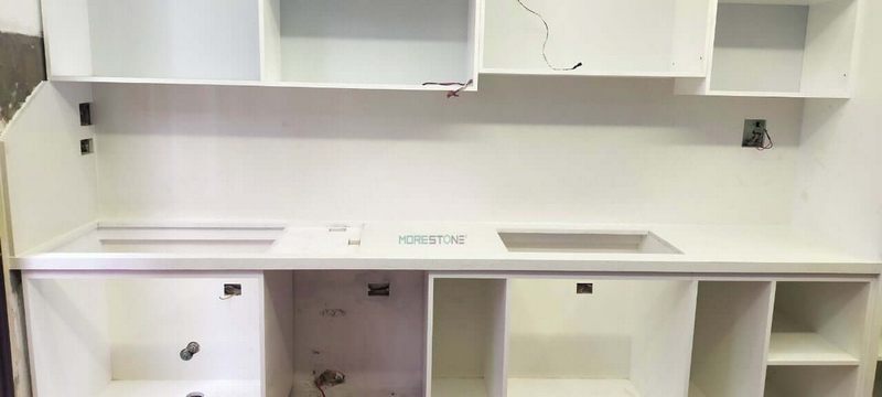 Màu trắng đẹp của đá ốp bếp nhân tạo sẽ làm nên sự bền bỉ cho không gian phòng khách hiện đại.